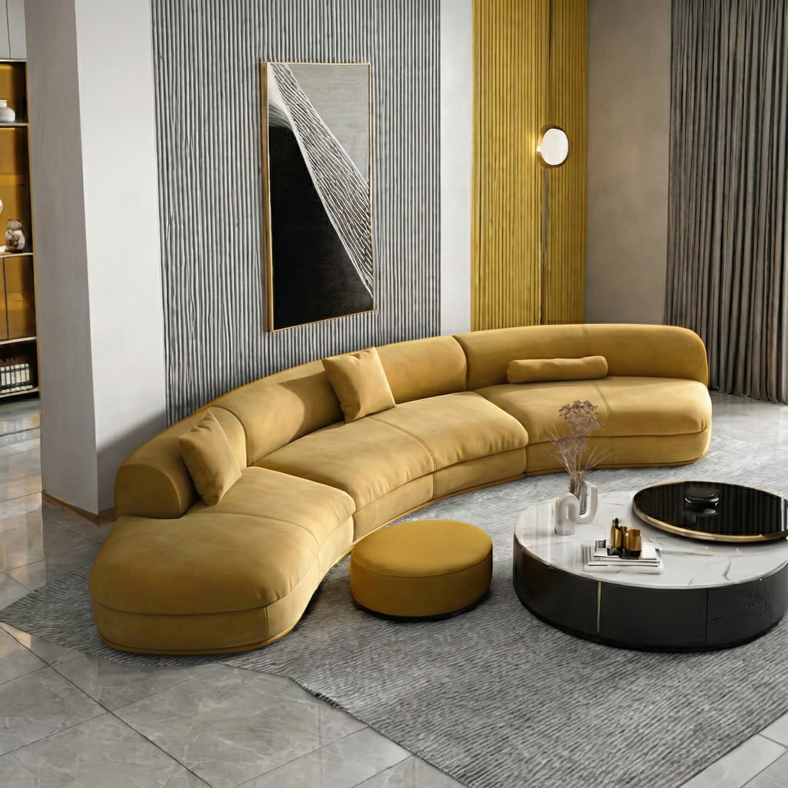 Contemporary Mustard Yellow Velvet Curved Sofa & Marble Coffee Table Set