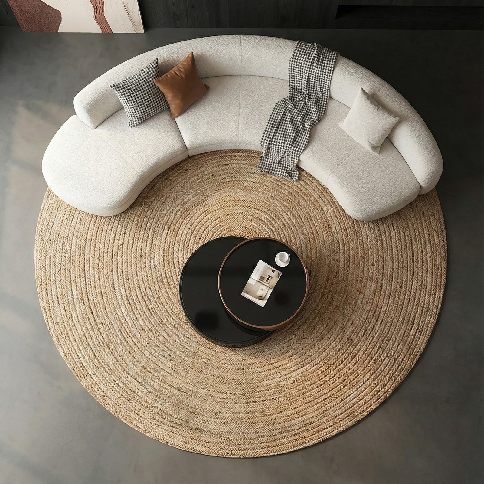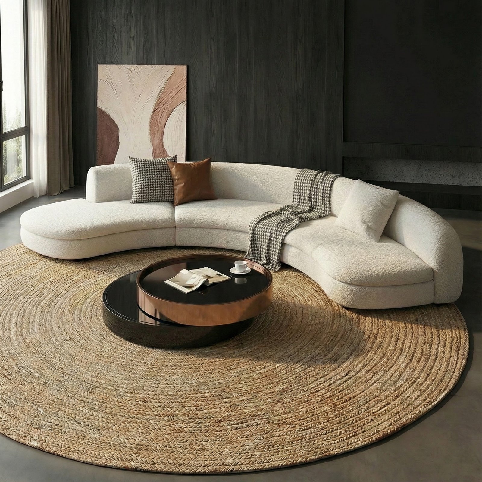 Modern Curved Living Room Set with Bouclé Sofa and Jute Rug