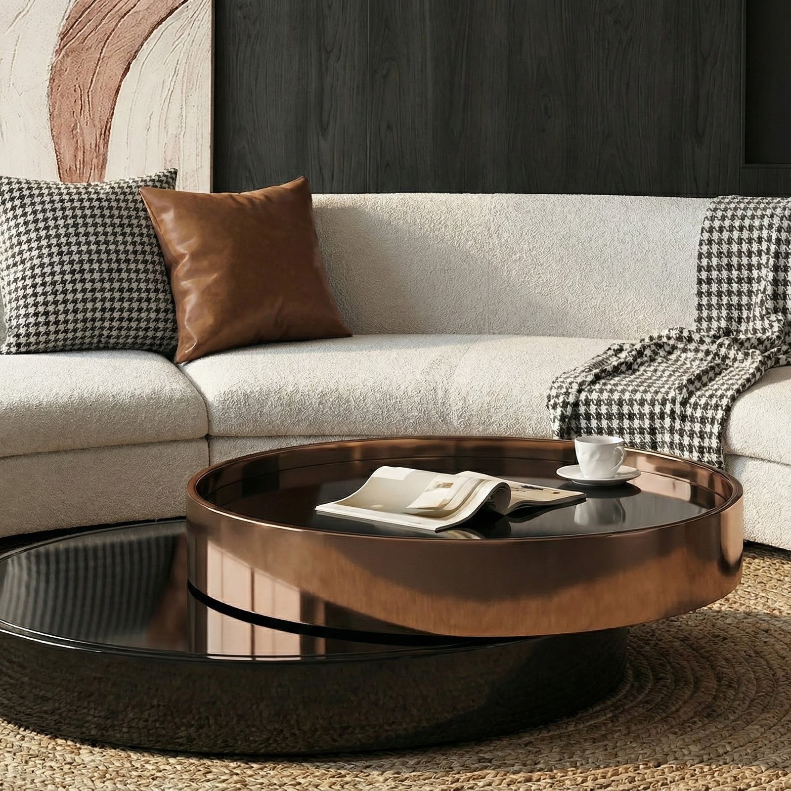 This luxurious living room ensemble features a striking curved sofa upholstered in a textured white bouclé fabric, providing a soft and inviting focal point. It is accented with a mix of brown leather and houndstooth patterned pillows and a matching throw blanket. The sofa is perfectly framed by a large, round natural jute rug, adding warmth and organic texture to the space. At the center are nested round coffee tables, a chic combination of polished black and brushed copper metal finishes, topped with books and a ceramic cup. The backdrop includes a dark wood panel wall and a large abstract art piece, creating a sophisticated and cozy contemporary setting.