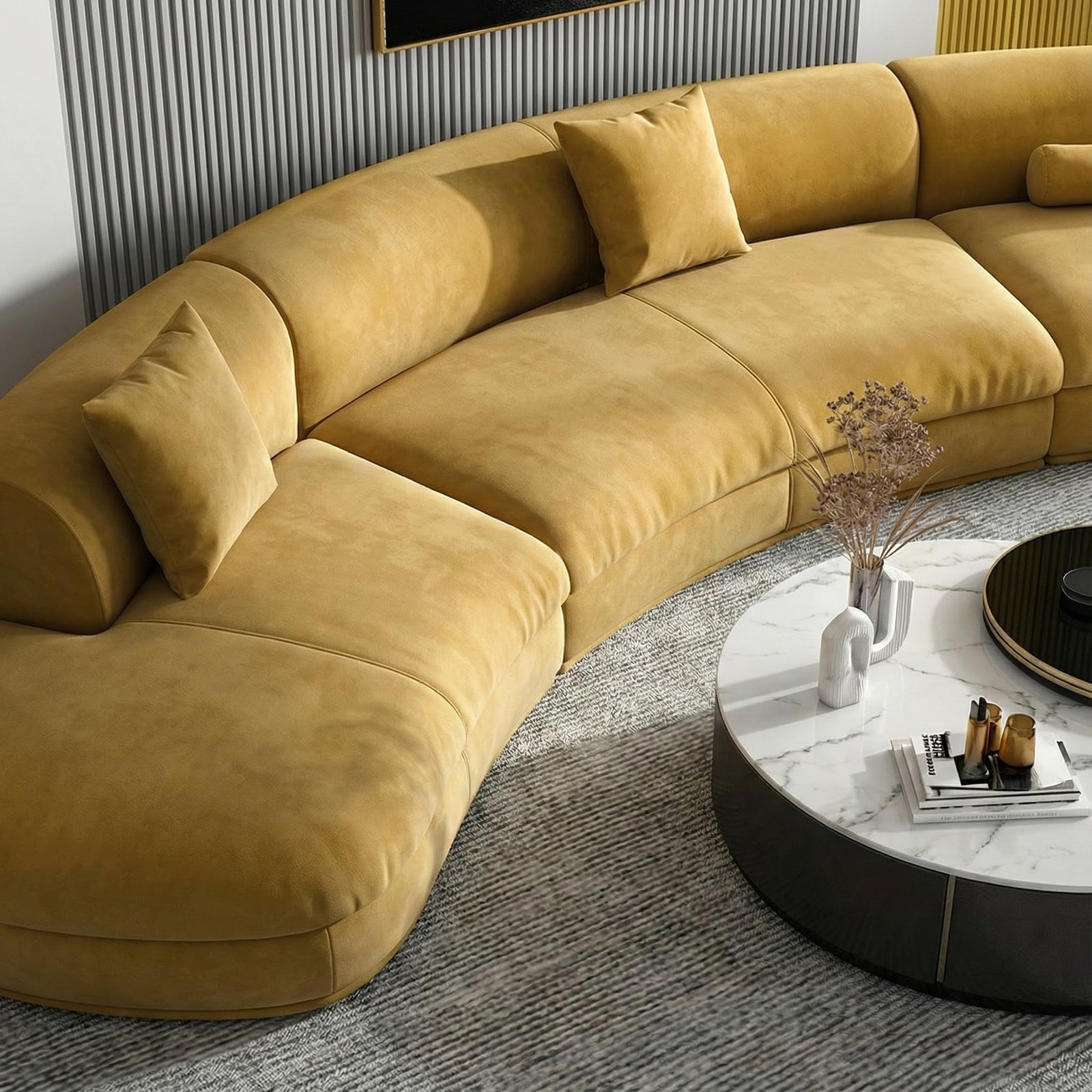 This luxurious living room set features a statement-making curved sofa upholstered in plush mustard yellow velvet, complete with matching scatter pillows for added comfort and style. The sofa’s inviting shape is perfectly complemented by a large, round coffee table with a sophisticated white marble top featuring subtle grey veining, resting on a dark metal drum base. The table is styled with curated decor, including books and a vase with dried botanicals. The entire arrangement is anchored by a textured grey area rug and set against a modern backdrop of grey fluted wall panels with a touch of gold, creating a chic and inviting contemporary living space.